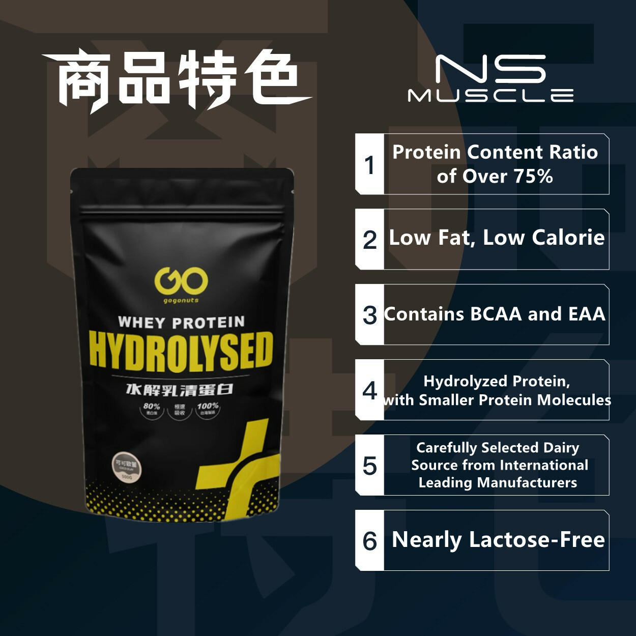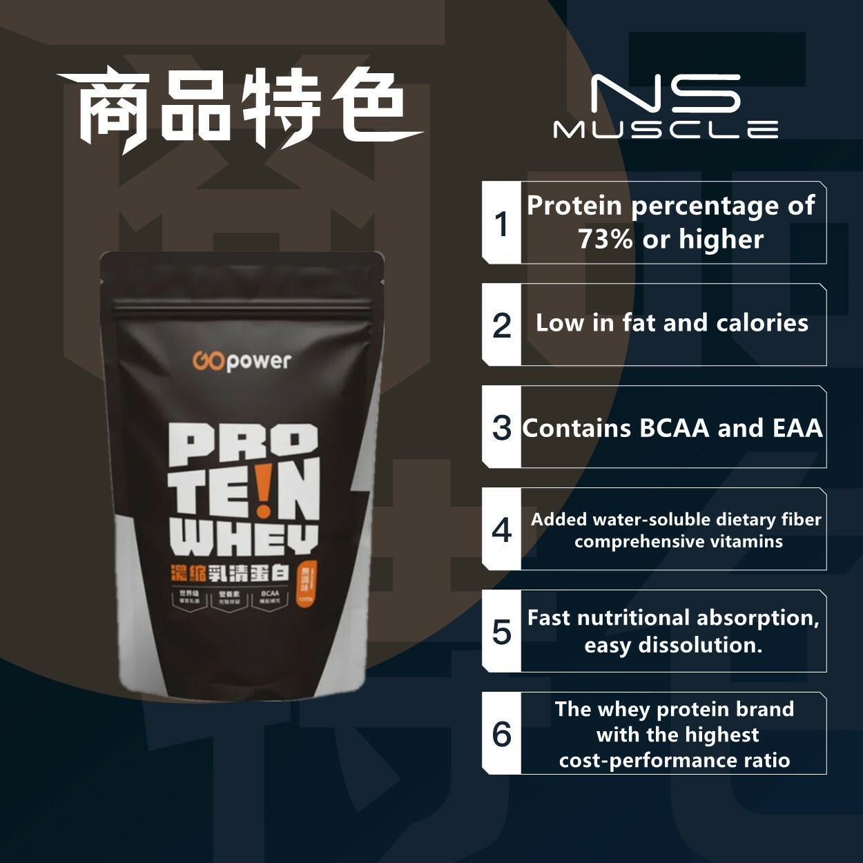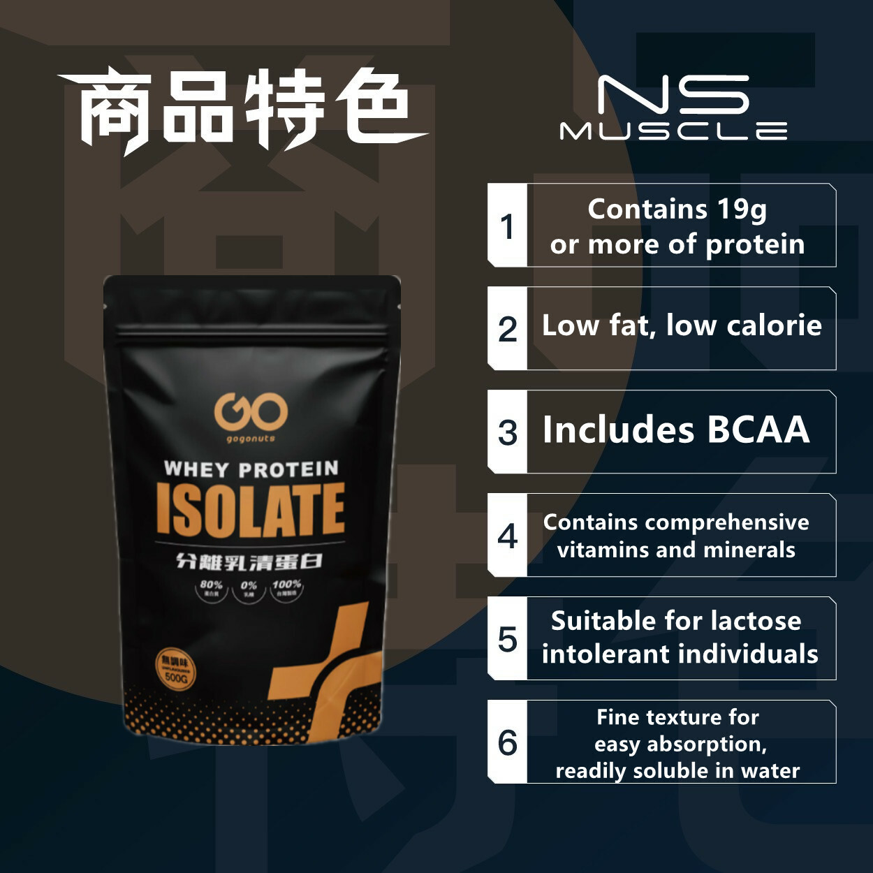 - 針對國人口味所調配蛋白質營養補充品,口感接受度高