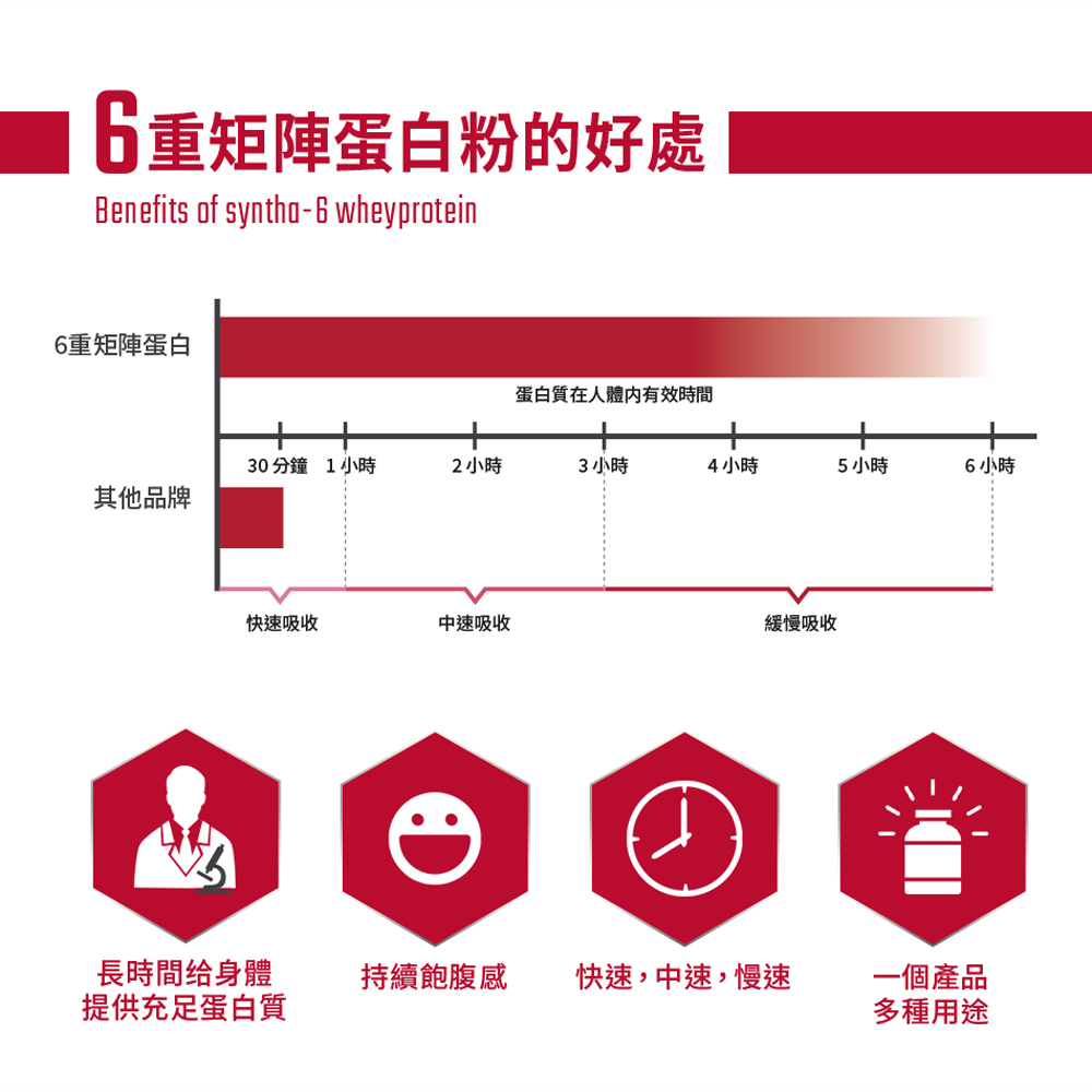 - 獨特的6種乳清蛋白配方,用不同消化速度的胺基酸配方