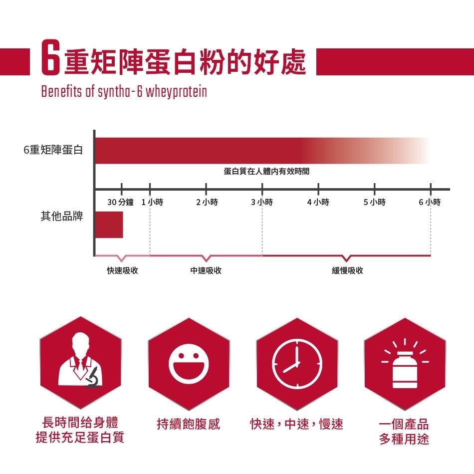 - 6種不同結構的蛋白質組成,容易吸收,長效提供營養。