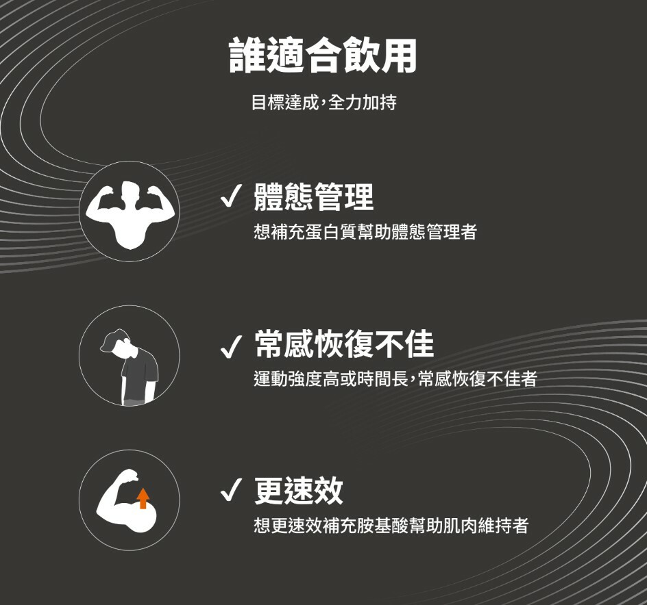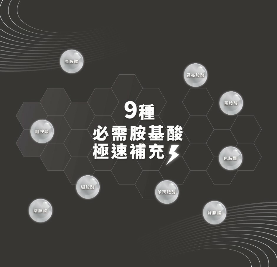 - 一次攝取 9種必需胺基酸,黃金比例幫助運動表現