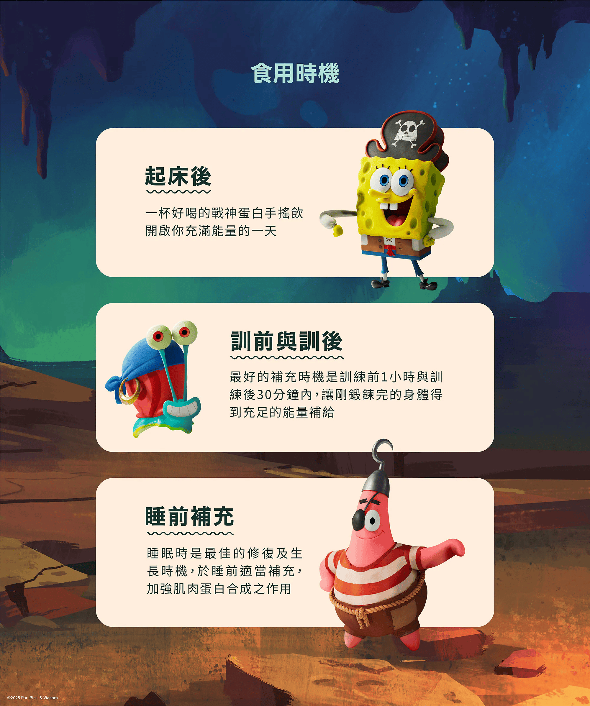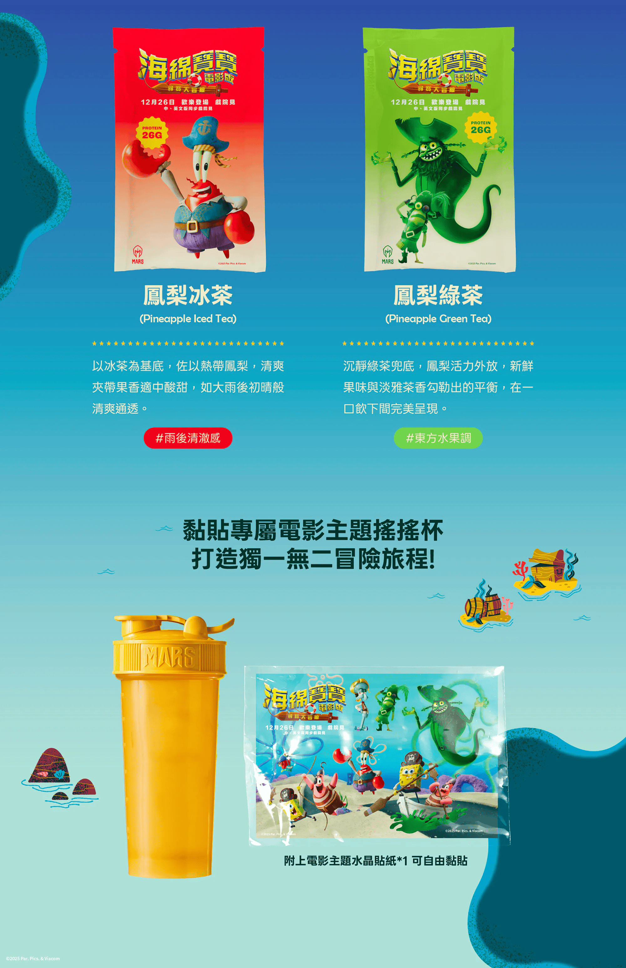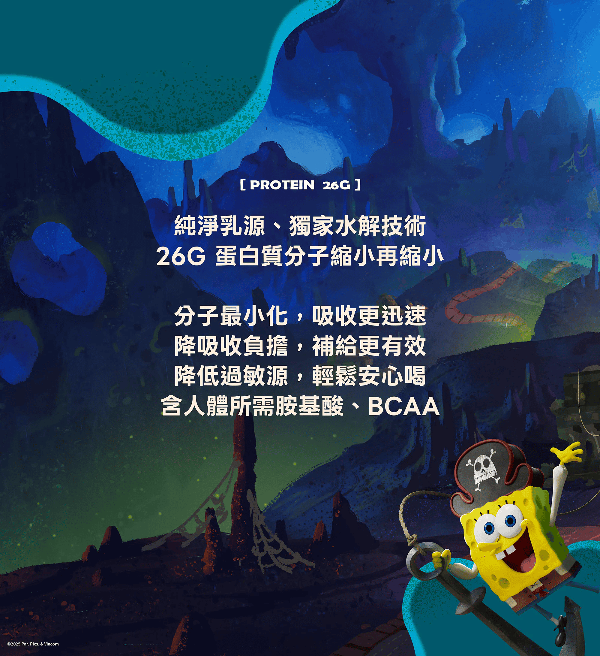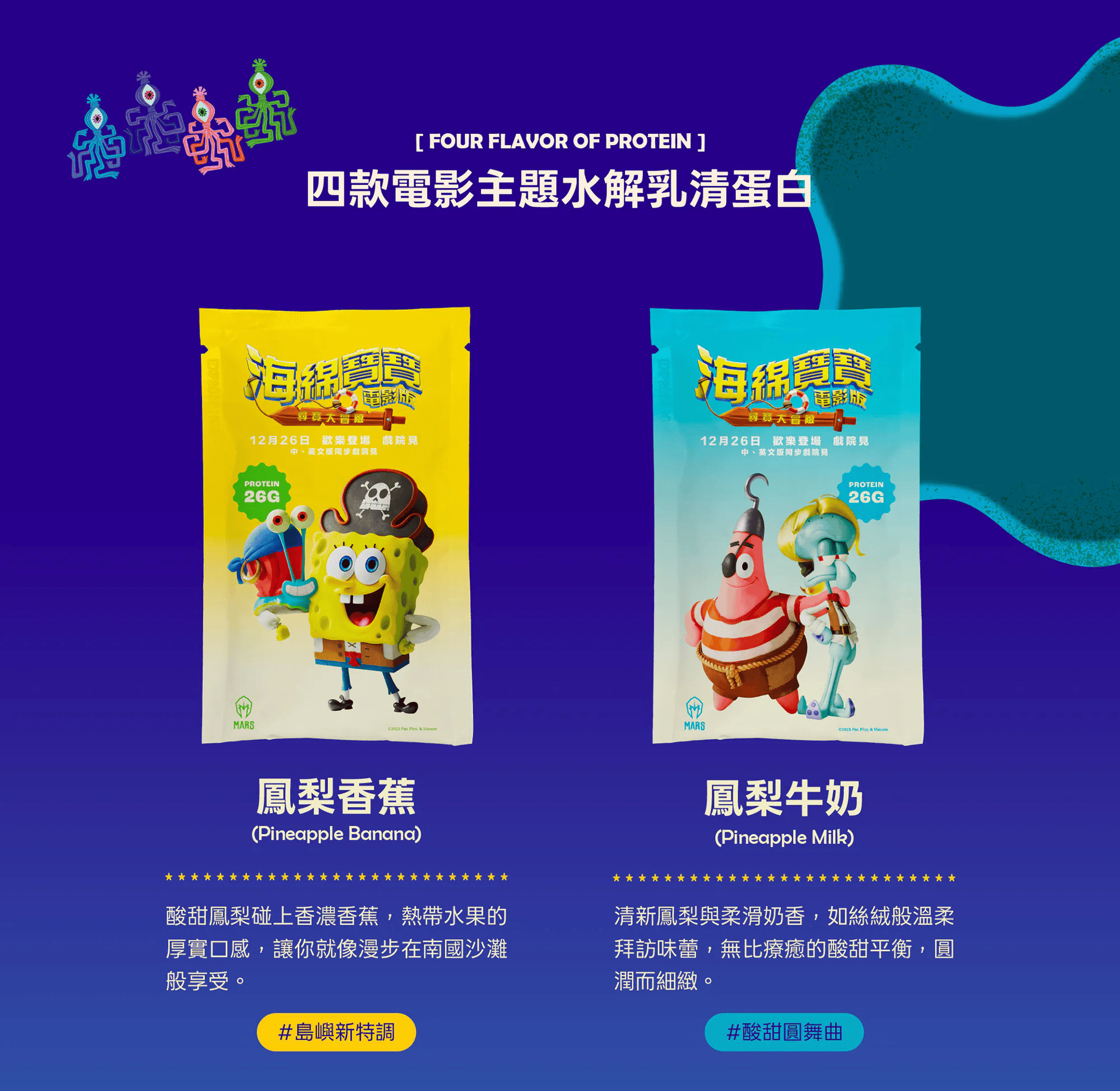 -海綿寶寶系列最標誌性的大鳳梨,融合四種不同的底蘊,帶來海底冒險必備的水解乳清蛋白補給新風味