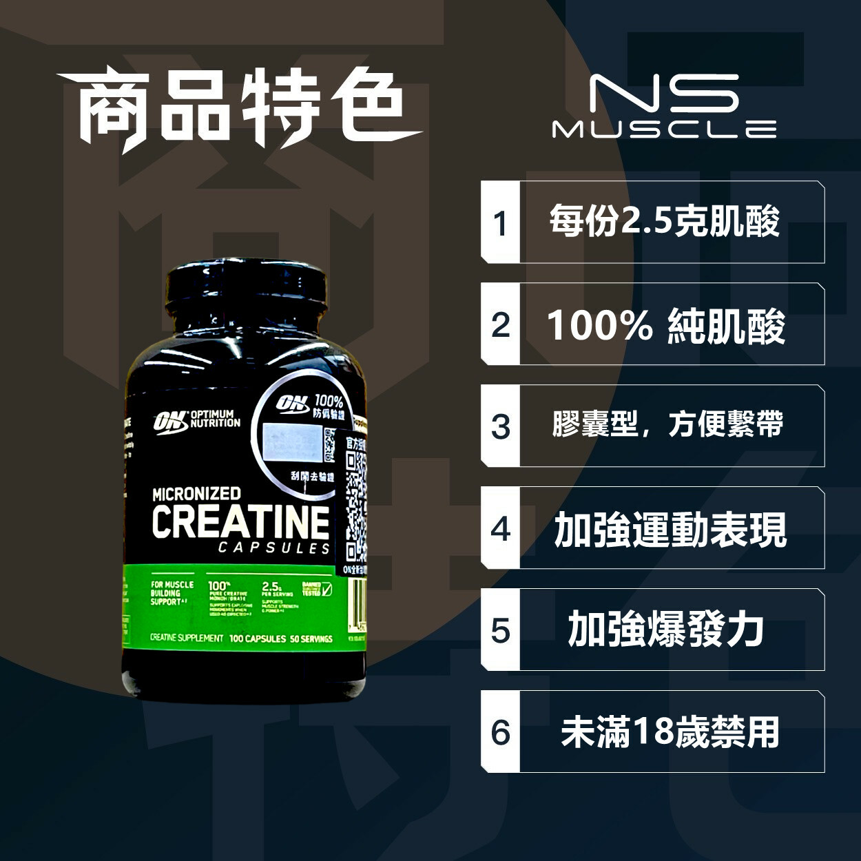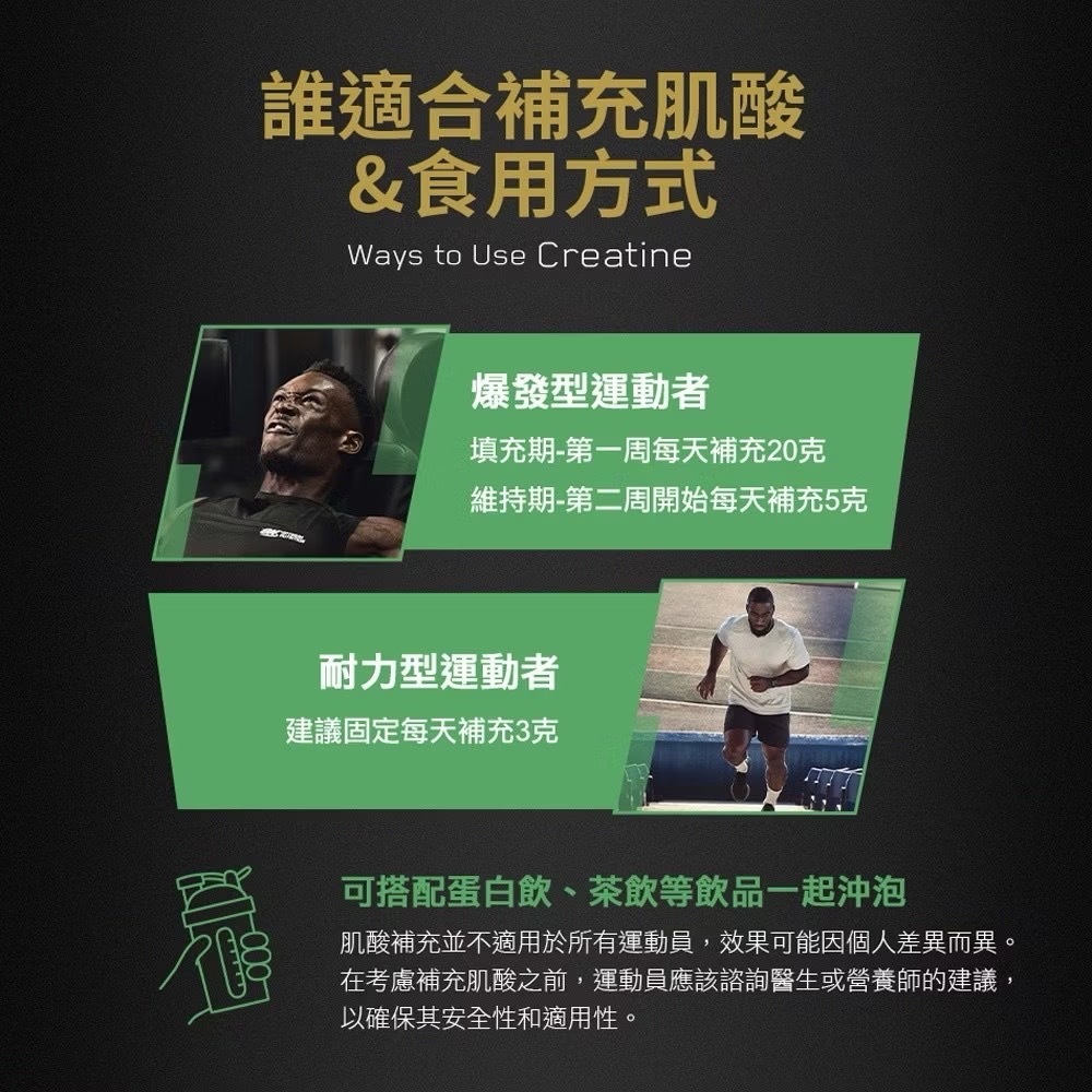 - 2顆為一份,每份2.5克純肌酸